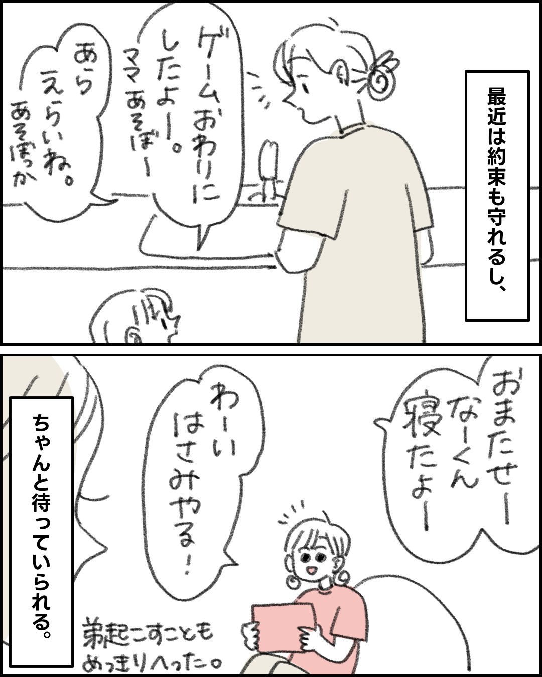 パパがいるとのコマ、うちのことかと思いましたwww うちの上の子はえっちゃんのような優等生ではなくむしろ困らせてる方ですが、いっときに比べたらずいぶん聞き分けが良くなり、最近は少し言えばすんなり納得してくれるようになりました(ママ限定) ホッとした途端に下の子が手がかかりまくって毎日息切らして寿命縮めてますwww